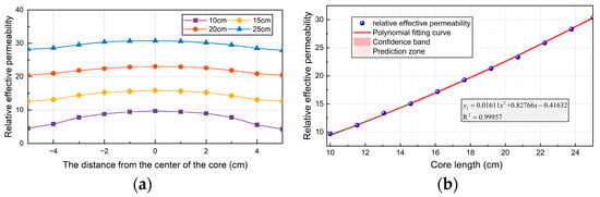 The influence of core length on the performance of the sensor is studied by establishing the simulation model of four cylindrical cores. The radius of the core is 2 cm, and the length is 10, 15, 20, and 25 cm, respectively. The relationship between the relative effective permeability of each length of the core and its position in the core is shown in Figure 5a. Figure 5b shows the relationship between the relative effective permeability of the geometric center of the core and the length of the core.