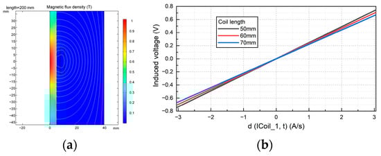The effect of the ratio of coil length to core length on the inductive magnetic field sensor is shown in Figure 7b. The simulation results show that, to obtain a larger induction voltage, the induction coil should be distributed near the center of the magnetic core. Taking a magnetic core with a diameter of 10 mm and a length of 200 mm as an example, at a distance from the center of the core ±33 mm, the magnetic field intensity of the core is reduced by about 7% to the maximum value, and the sensitivity of the sensor also meets the requirements. Therefore, the induction coil is distributed at the center of the magnetic core, and the ratio of the length of the magnetic core to the length of the induction coil is 0.3.