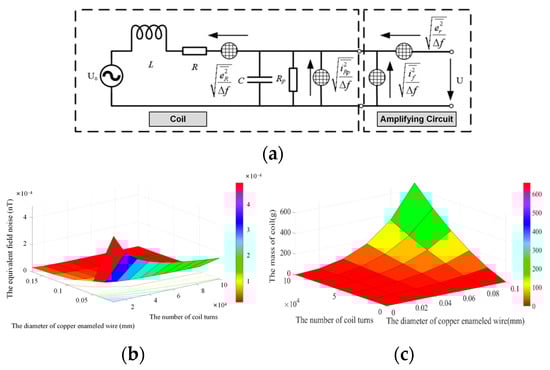 Diagram related to parameter optimization of induction coil: (a) Sensor noise equivalent circuit diagram; (b) The equivalent magnetic field noise from the magnetic field sensor; (c) The relationship between the coil mass, the coil parameters, and the diameter of copper enameled wire.