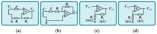Schematic diagrams of inverted and in-phase proportional amplifiers are shown in Figure 12a,b, where Z is the total impedance of the induction coil.