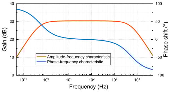 The simulation circuit diagram of the amplification circuit of the inductive magnetic sensor is built by using Multisim14. As shown in Figure 14, the AC voltage source V1 is used to simulate the induced electromotive force produced by the induction coil, and the coupled induction coil T1 is used to simulate the induction coil and feedback coil. The amplitude-frequency and phase-frequency characteristics of the amplifying circuit are detected by Multisim, and the amplitude-frequency characteristic curve and phase-frequency characteristic curve are obtained, as shown in Figure 15. The amplitude-frequency characteristic curve and the phase-frequency characteristic curve in the range of 10–1000 Hz are relatively flat, and the magnification meets the design requirements, which meets the design requirements of the inductive magnetic field sensor in this paper.