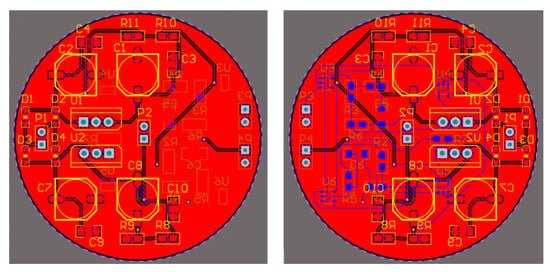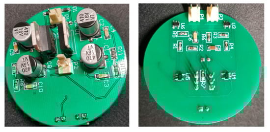 The corresponding PCB diagram is generated according to the schematic diagram of the amplifying circuit. To reduce the volume of the magnetic field sensor, the PCB circuit board adopts a double-layer design. The top layer is the power supply circuit, and the bottom layer is the amplification circuit. The 2D effect and physical drawings of the circuit wiring are shown in Figure 16 and Figure 17.