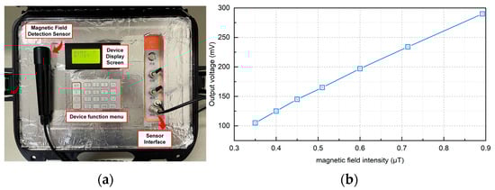 The sensitivity calibration curve obtained at 50 Hz is shown in Figure 18b. It can be seen that the output voltage of the magnetic field sensor and the magnetic field intensity show a good linear relationship. It is calculated that the sensitivity of the magnetic field sensor is about 327.6 mV/μT, which also means that the sensor has good performance in sensitivity and meets the current demand for cable detection in the field of power engineering. The device can achieve the reduction of volume and the improvement of portability while maintaining high precision. This feature enables the staff to use the equipment in any environment in the actual power operation and maintenance process and not have to adhere to distance, power, and other limiting factors.