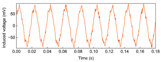 The magnetic field sensor is close to the single-phase cable and displays the induced voltage waveform measured by the magnetic field sensor through the oscilloscope. By adjusting the voltage regulator, the current through the cable is set to 60 A. When the single-core cable passes through the power-frequency alternating current, the power-frequency magnetic field is bound to be generated around the cable. The voltage changes when the sensor is placed in an alternating magnetic field. The induced voltage waveform measured by the magnetic field sensor is shown in Figure 20.