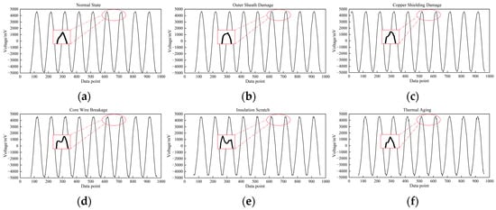 Experimental test results. Magnetic field waveforms of different cable conditions. (a) Normal state. (b) Outer sheath damage. (c) Copper-shielding damage. (d) Core wire breakage. (e) Insulation scratch. (f) Thermal aging.