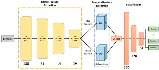 Figure 4 shows the model architecture proposed in this study, which includes three parts: The first part is the spatial feature extraction unit, composed of four layers of 2S 1D-CNN+CCO. The second part is the temporal feature extraction unit, consisting of two Bi-GRUs, with the magnitude (Mag) features and phase (Phase) features inputted into the Bi-GRUs. The third part consists of a concat layer and a three-layer fully connected (FC) layer, used for action recognition.