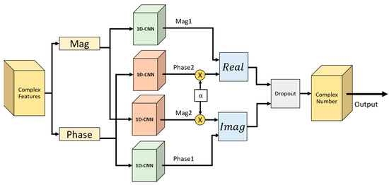 Figure 5 illustrates the 2S 1D-CNN+CCO architecture. The magnitude and phase features are separately input into the 2S 1D-CNN to extract the primary features (Mag1 and Phase1) and the secondary features (Mag2 and Phase2). The secondary features, after being multiplied by the weight parameter α, are passed to the Real and Imag components to integrate both the primary and secondary features. The method of calculation is presented in Equation (5).