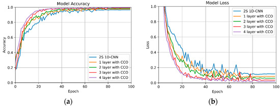 Figure 7 displays the learning curves for the validation set of 2S 1D-CNN compared to the most effective combinations of 2S 1D-CNN + CCO. The findings of this study indicate that regardless of the number of 2S 1D-CNN + CCO layers implemented, both the accuracy and loss metrics for the validation set surpass those of the standalone 2S 1D-CNN. Furthermore, there is a clear trend showing that performance improves with an increase in the number of 2S 1D-CNN + CCO layers utilized. The optimum results are observed when all four layers are configured with the 2S 1D-CNN + CCO model.