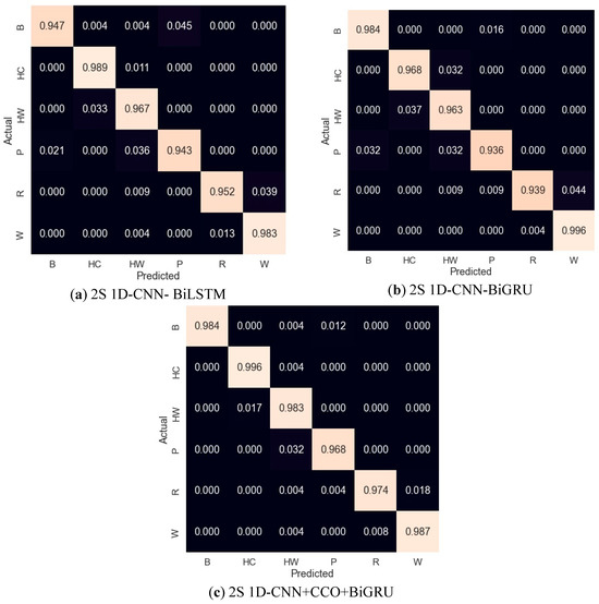 In this study, we present an in-depth analysis of the activity recognition capabilities of three distinct computational models: 2S 1D-CNN+BiLSTM, 2S 1D-CNN+BiGRU, and our proposed 2S 1D-CNN+CCO+BiGRU. The evaluation spans various activities, denoted as B, HC, HW, P, R, and W, to encompass a broad spectrum of potential applications, as shown in Table 8. Figure 8 shows the activity-wise confusion matrix for all three models, (a) 2S 1D-CNN+BiLSTM, (b) 2S 1D-CNN+BiGRU, and (c) 2S 1D-CNN+CCO+BiGRU.