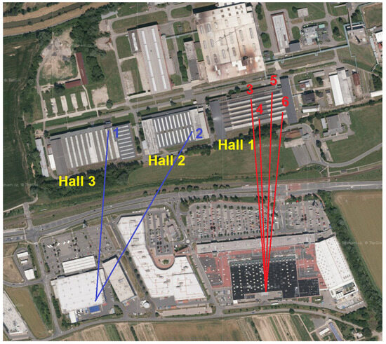 The measurements were conducted at Tajmac-ZPS, a.s. in three of its halls. Figure 2 illustrates the distribution of individual measuring points and transmitters via an aerial view. The upper half of the picture displays the company premises, while the lower half depicts a large shopping mall where the transmitters, Base Transceiver Station—BTS (Evolved Node B—eNB or Next Generation Node B—gNb) [18,29]—were situated. The distance between the eNB/gNb and our measurement points ranged between 400 and 450 meters. This area was exclusively covered by 5G cellular networks operating at 700 MHz. Based on the current qualitative parameters of the RF signal, the measurement device automatically selected the eNB/gNb to connect to. Throughout the measurements, we were connected to two transmitters, as depicted in Figure 2. Notably, no handovers were observed during the measurement campaign at individual locations. Transitions to different transmitters occurred only with a change of location and a subsequent re-connection to the network. The indoor environment of the factory is depicted in Figure 3. The 4G/5G connectivity measurements were carried out at six measurement locations inside the factory, and a brief description along with an illustrative photo is available in Table 2.