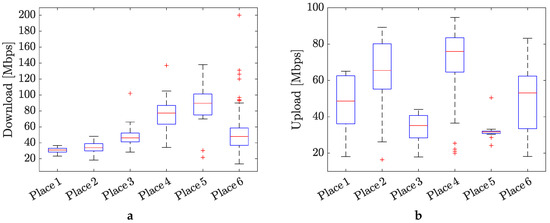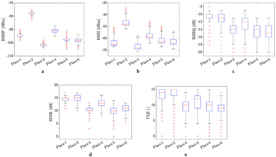 The statistical evaluation of the measured KPI values in the form of box plots is presented in Figure 5 and Figure 6, respectively. The obtained results in terms of KPIs clearly shown the influence of the positioning of the measurement equipment on the mobile signal quality. Overall, the RSRP values, repressing the power of the LTE reference signals spread over the full bandwidth and narrowband, indicate moderate 4G mobile signal quality (see Figure 5a). The best (excellent) and worst (bad) signal quality were monitored at places no. 2 and no. 3, respectively. It is interesting that the positioning of the measurement equipment on the top of the electrical panel at place no. 2 practically did not have any negative influence on the values of RSRP.