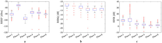 Similar statistical analysis has been provided for the 5G cellular signal quality in terms of RSRP, RSRQ, and SINR, and the results are displayed in Figure 6a–c. Compared to the RSPR values measured for the 4G mobile signal, the RSRP values obtained for the 5G mobile network indicate the stronger power of the LTE reference signals at all places where the measurement were conducted. However, the situation is a bit different for parameters RSRQ and SINR. In both cases, we can observe better cellular signal quality than in the case of 4G mobile signal. It is especially true for SINR, where some negative values indicate that the 5G network may have some short-term outages in the current location. However, the measured 5G mobile signal in both cases is more unified, and in terms of quality, it is comparable for all places where the measurements were conducted.