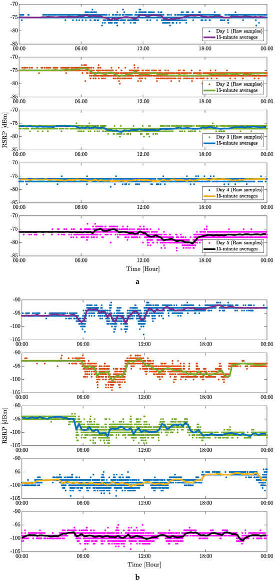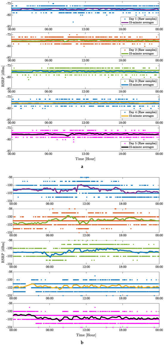 Five days of static indoor (inside of a factory) measurement of 4G mobile signal in terms of RSRP: (a) Place no. 2 and (b) Place no. 3.