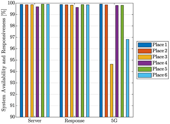 The server availability determined from the measurements is shown in Figure 9. The first group of bar graphs, labeled as Server, represents the percentage of times that the server was able to connect when the modem-to-server-to-modem packet travel time was under 2 s. The second group of columns (Response) represents the percentage of time the response was under 100 ms, which can be considered sufficient for any Internet service. Finally, the columns labeled 5G indicate what percentage of the time the measured location had 5G system availability. As can be observed, the 5G system availability was lower than 97% only at places no. 3 and 6.