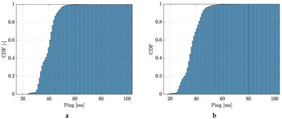 The Cumulative Distribution Function (CDF) [30] of server responses measured at two different places is shown in Figure 11. From the perspective of system response, i.e., the time it takes for the measurement packet to travel from the device to the server and back, it can be observed that there were no fluctuations. The response time averaged approximately 40 ms, a low enough value for universal use. This response time was consistent across different times and locations, regardless of the associated signal strength.