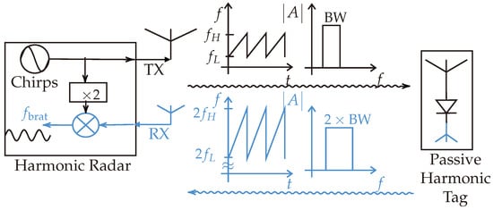 Proposed system functionality illustration. The dashed black and red curves represent the reflected signals in the fundamental frequency domain that will be received by a linear radar. The blue and dashed blue curves represent the backscattered chirps in the harmonic domain that will be received by the harmonic radar.