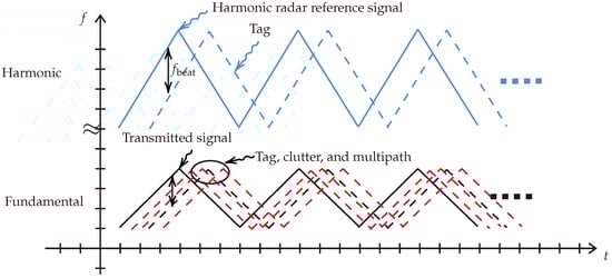 In principle, the system transmits continuous frequency ramps, as illustrated in Figure 2, which also shows the backscattered clutter signals in the fundamental channel. The transmitted ramp’s slope is , where B represents the signal bandwidth, and T signifies the ramp sweeping time. The backscattered signal from the harmonic tag is located in the harmonic channel of ramp slope , representing a clutter-free signal.