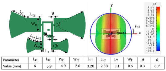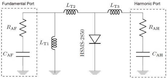 Chipless RFID tags grapple with clutter, which can be mitigated by introducing non-linearity into the tag’s antenna structure, generating higher harmonic frequencies. This differentiation allows the tag’s backscattered signal to be discerned from the environment. The existing literature indicates that incorporating a ground plane and matching it with lumped elements poses obstacles to tag printing, particularly when utilizing printable Schottky diodes []. Consequently, designing a single-layer, compact, lightweight, and efficient harmonic transponder becomes pivotal for full harmonic tag deployment. The utilized transponder comprises two bow tie dipoles matched to the diode via a T-matching network [], as depicted in Figure 3. The planar T-matching network, unlike the distributed short-circuited stubs introduced in the literature [], is compact and does not require grounded vias for diode matching, thus enjoying more acceptance.