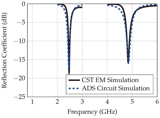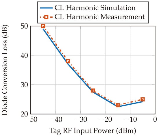 Figure 18 shows the simulation and measurement results of the diode conversion loss integrated to the designed harmonic tag. The circuit illustrated in Figure 4 is simulated in PathWave’s Advanced Design System (ADS) simulation tool and then compared with the measured data.