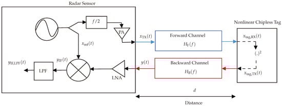 where is the diode’s conversion loss, as discussed in [,]. Further details regarding antenna integration, polarization, and analog aspects are presented in []. The effect of the diode on the signal phase is not considered in the model or in this paper, since the utilized signal processing considers only the signal’s amplitude.