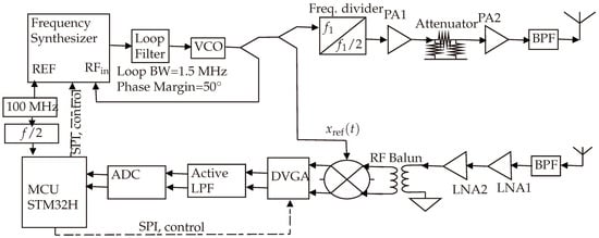 Detailed block diagram of the realized harmonic FMCW radar. The signal generated from the frequency synthesizer is an FMCW signal of frequency 4.8–5.0 GHz, which then passes through a frequency divider to generate the 2.4–2.5 GHz FMCW signal. This makes the reference signal as clean as possible.