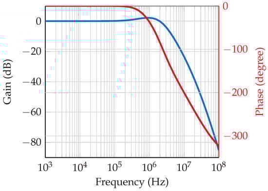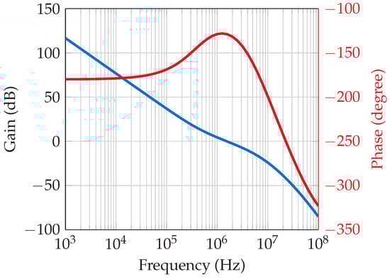 Within this system, a phase-locked loop (PLL) circuit is designed using the ADF4159 [] frequency synthesizer chip with chirp/ramp functionality. The loop filter features a bandwidth of 1.5 MHz and a phase margin of 50°, as depicted in Figure 8 and Figure 9, which represent the open-loop and closed-loop gains, respectively. The loop bandwidth holds significance in a phase-locked loop (PLL) system, as it determines the range of frequencies over which the PLL can effectively track changes in the input signal. A wider loop bandwidth facilitates faster locking onto the input signal, albeit at the cost of increased susceptibility to noise. Conversely, a narrower loop bandwidth rejects more high-frequency noise while potentially prolonging the locking process. The choice of bandwidth necessitates a careful balance between noise performance and lock time. Additionally, the phase margin gauges the system’s resilience to variations in the phase of the input signal. A higher phase margin indicates superior stability, whereas a lower phase margin may result in instability. Further elaboration on the PLL’s functionality is provided in [,].