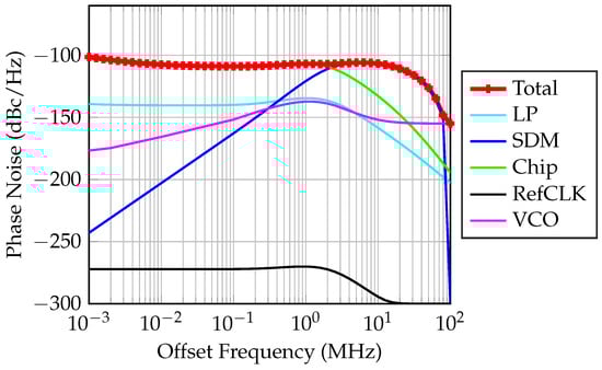 Phase noise within an FMCW radar system can significantly impact the accuracy of range measurements. This phenomenon affects the fidelity of both transmitted and received signals, leading to inaccuracies in estimating the range to a target. Phase noise manifests as deviations in the output frequency. Random fluctuations induced by phase noise in the instantaneous frequency of transmitted and received signals can deviate from the expected linear chirp waveform. Consequently, the measured beat frequency utilized for range determination may be affected, resulting in estimation errors and contributing to overall range inaccuracies. Extensive analysis of phase noise’s influence on FMCW systems is presented in [,,,]. The cumulative phase noise of the designed PLL is estimated and visualized in Figure 10. It encompasses phase noise from the LP (loop filter low-pass filter), the SDM (sigma-delta modulator), the chip (the ADF4159 chipset), Refclk (the reference clock used for the PLL), and the VCO. The total phase noise is quantified at −110 dBc/Hz.