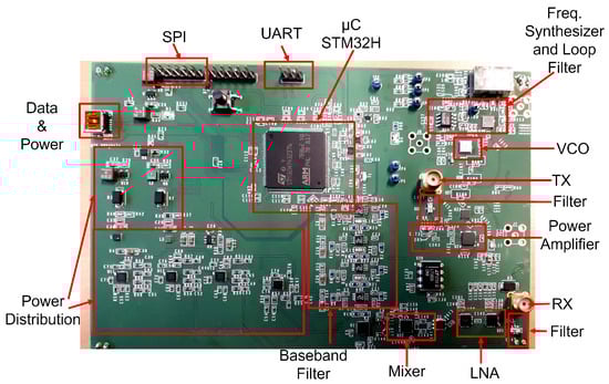 Prior research has considered the realization of harmonic radar to estimate the range of harmonic objects. The system introduced in [] describes the design and implementation of a harmonic radar system (from 60 to 64 GHz) using self-designed monolithic microwave integrated circuits (MMICs) for an active harmonic tag. The system proposed in [] relies on an implemented MMIC (from 78 to 80 GHz) and a realized active harmonic tag to detect pedal cyclists in outdoor scenarios. The utilization of millimeter wave optical harmonic transponders for tracking small insects is discussed in []. It mentions the prototype radar operating in the CW mode of frequency 38.5 GHz and its detection range of up to 1 m with an active tag. These research studies use active harmonic tag designs to compensate for the high loses at the utilized frequencies. Moreover, there are some other harmonic radar realizations with passive tags. In [], two compact low-cost FMCW harmonic radar prototypes for insect tracking are proposed. They are operating at the S-band and the X-band with output power of 3 W and 10 W, respectively. In addition, a portable low-power harmonic radar system is introduced in []. The radar unit transmits a 5.9–6 GHz signal and detects the 11.8–12 GHz harmonic created by the passive tag. Most of these research studies consider an outdoor scenario, whereas our proposed system focuses on an indoor test case. Furthermore, aside from the previous work, our proposed system consider the well-known industrial, scientific, and medical (ISM) band of 2.4 to 2.5 GHz. The proposed harmonic radar realization in this paper differs from the aforementioned research in that (i) the entire design is implemented on one PCB with off-the-shelf components, (ii) the system design provides a high mitigation of the generated harmonics from the transmitter, and (iii) the introduced system design provides a low phase noise, which negatively affects the performance of FMCW systems.