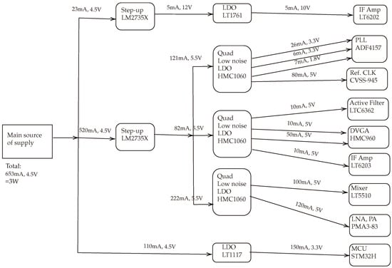 Figure 12 shows a diagram of the power supply tree, detailing the distribution and individual power consumption of various components in the designed system. The main power supply delivers a total of 653 mA at 4.5 V, amounting to an overall power consumption of approximately 3 W, which could be easily delivered from a battery. This supply branches into several pathways, each with step-up converters or low-dropout regulators (LDOs) to adjust the voltage for specific components. This design guarantees a stable and low-noise DC voltages for all the critical RF and digital components.