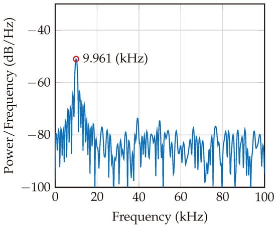 Beat frequency for a target at a distance of 0.37 m. The peak at 9.961 kHz indicates that there is one predominant harmonic tag existing at a distance of 0.37 m.