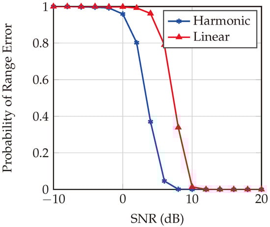 The comparative performance of harmonic and linear FMCW radar systems within a multipath channel is meticulously evaluated, with Figure 15 illustrating the probability of range error across SNR values ranging from −10 dB to 20 dB for a target at a distance of 1.87 m. The figure reveals that, at low SNR levels (from −10 dB to approximately 0 dB), both systems exhibit high probabilities of range error, which is expected due to the increased noise relative to the signal that hampers precise range determination. Notably, between 0 dB and 10 dB SNR, the harmonic FMCW system demonstrates a gradual improvement, sustaining a lower probability of range error compared to its linear counterpart, suggesting superior noise resistance at these SNR levels. This enhanced performance can be attributed to two primary factors: the higher operational bandwidth of the harmonic system, which facilitates better range resolution, and its diminished susceptibility to clutter effects that significantly disrupt signal integrity in the linear FMCW system under low-SNR conditions. Ultimately, at SNR values exceeding 10 dB, both systems exhibit commendable performance.