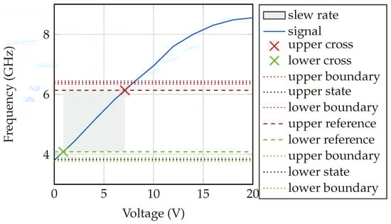 Slew rate of the VCO used to generate the sweeping signal. The slew rate is 329.93 MHz/V.