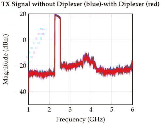 The measurement setup illustrated in Figure 19 was deployed to capture the measured signals. On the transmitter side, an antenna with 7 dBi gain (APA-M04 []) operates within the fundamental frequency range (2.4 to 2.5 GHz). Conversely, an 8 dBi antenna (APA-M25-6E []) is employed on the receiver side within the harmonic frequency range (4.8 to 5.0 GHz). The transmitted signal power is 10 dBm EIRP.