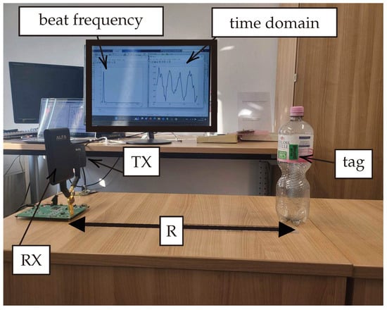 The passive tag is mounted on an empty bottle of water to evaluate the impact of positioning the tag on plastic material, deliberately excluding the water’s dielectric properties from our initial considerations. Potential clutter interference is hypothesized to originate from nearby metallic objects or the concrete structure of the surrounding environment. Looking ahead, we plan to extend our investigation by mounting the passive tag on a variety of real-world products, each characterized by distinct dielectric properties. This future work aims to assess the system’s performance across a broader spectrum of conditions and define the operational limits accordingly. To ensure the utmost accuracy in our measurements, the position of the target (the passive tag mounted on the water bottle) was precisely determined using a Bosch GLM 500 laser meter. This instrument enabled us to ascertain the exact distance between the tag and the system’s TX/RX antennas, ensuring that our data reflect true distances with high fidelity.