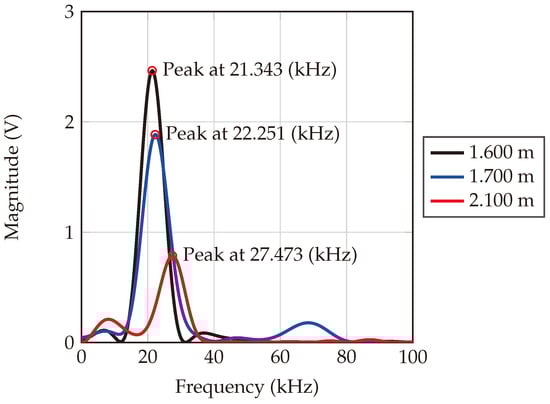 Measurements were conducted at three different distances: 1.600 m, 1.700 m, and 2.100 m. The corresponding beat frequencies are 21.343 kHz, 22.251 kHz, and 27.343 kHz, respectively, as depicted in Figure 20. Each peak in the data corresponds to a beat frequency that uniquely represents a specific distance between the radar and its target. Notably, as the distance measured increases, so does the frequency position of each peak. Furthermore, the observed decay in signal magnitude between the distances of 1.600 m and 1.700 m is minimal, attributable to the mere 10 cm difference between them. Conversely, a significantly greater magnitude decay is observed at a distance of 2.100 m, reflecting the larger distance from the radar.