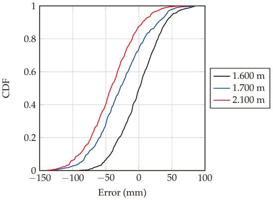 The cumulative distribution function (CDF) is calculated for the 500 measurement iterations for the aforementioned tag positions, as depicted in Figure 21. The CDF function shows the probability that a variable is less than or equal to a certain value. For a given value on the x-axis (error in mm), the CDF value on the y-axis indicates the fraction of measurements that were below that error threshold. As observed from Figure 21, the black curve (1.600 m dataset) is closest to the center, indicating that measurements at this distance had a lower error compared to the other two distances. Moreover, the median error, which corresponds to CDF equal to 0.5, is 3.92 mm. Applying the same for the other datasets, then, the 1.700 m dataset provides a larger error, with a median error of −26.1 mm and finally 2.100 m dataset offers the largest error with a median error of −42.8 mm. Table 1 succinctly summarizes the median of the absolute errors of the measured distances for each actual distance for the 500 measurements, with actual distances gauged using a Bosch GLM 500 laser meter measuring device.