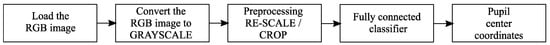 In Figure 1, the structure of the pupil center detection solution suitable for low-resolution eye images is presented. The images provided by the video camera are converted to grayscale, resized to a size of 20 × 15 pixels, and then processed by a fully connected neural network-based classifier to identify the coordinates of the pupil center.