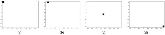Next, it is necessary to define the classes of the fully connected neural network-based classifier used in the system suitable for low-resolution eye images, illustrated in Figure 1. In this case, a number of classes equal to the number of pixels in the image is necessary (300 classes for the considered eye image resolution). Thus, Class 1 corresponds to those eye images in which the center of the pupil is in the upper left corner of the image, Class 2 to images in which the center of the pupil is in the first line and the second column of the image, and so on, with the last class corresponding to images in which the center of the pupil is in the lower right corner. Some such classes are exemplified in Figure 3 by illustrating the desired response of the neural network.