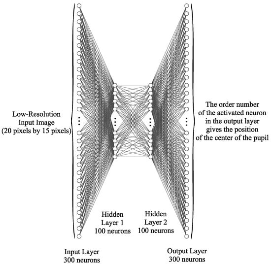 Due to the reduced number of pixels in the input images, the neural network can be implemented with layers of fully connected ReLU neurons. An architecture with four layers of neurons was used for implementation, as Figure 4 shows: an input layer containing 300 neurons that encodes the normalized gray intensities of each image pixel, two hidden layers of 100 neurons each, and an output layer that contains a number of neurons equal to the number of possible classes (actually the number of pixels in the image).