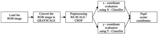 In what follows, a solution for implementing a pupil center detection system for high-resolution eye images (320 × 240 pixels) is presented in an efficient way from the point of view of resource consumption, with the structure of the proposed system being illustrated in Figure 5. The images provided by the video camera are converted to grayscale, resized to a size of 320 × 240 pixels, and then processed by two slim neural network classifiers to identify the coordinates of the pupil center.