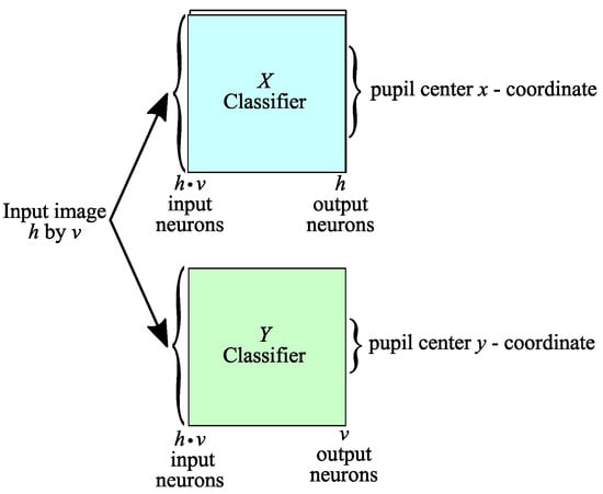 A significant reduction in the number of outputs would result if the proposed approach provided separately the two pupil center coordinates (x and y) by using two distinct neural network classifiers, respectively. Cumulatively, for the two neural networks, we will have the total number of neurons in the last layer given by the sum of the two dimensions of the input image, h + v, a value significantly lower than the product of the two parameters: