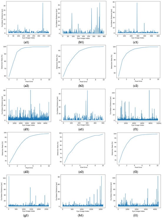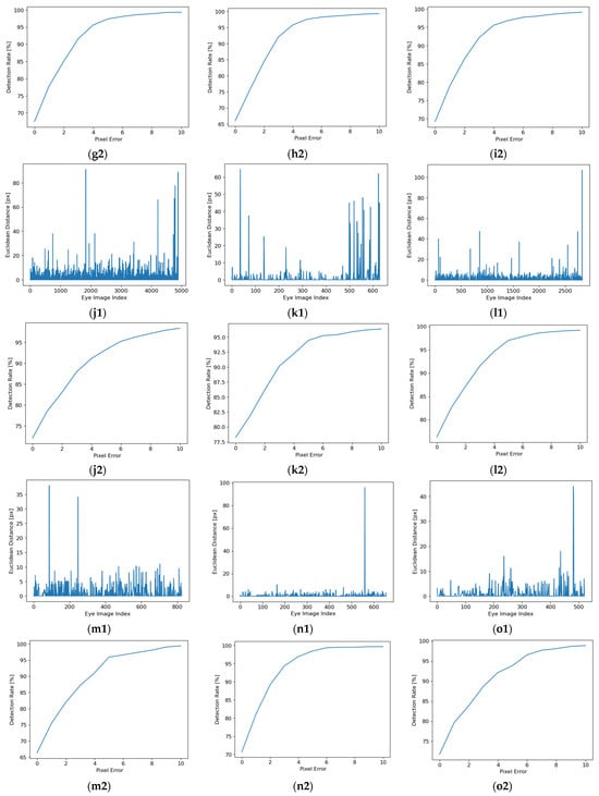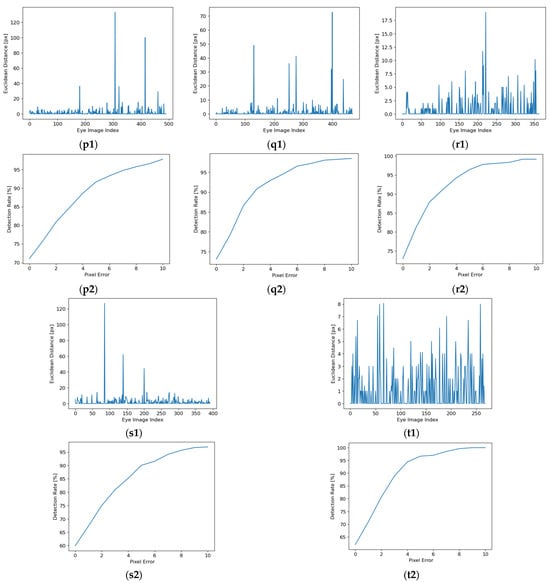 The Euclidian distance (between the detected and the manually labeled pupil center) for each eye image from each database: (a1) DB1; (b1) DB2; (c1) DB3; (d1) DSI; (e1) DSII; (f1) DSIII; (g1) DSIV; (h1) DSV; (i1) DSVI; (j1) DSVII; (k1) DSVIII; (l1) DSIX; (m1) DSX; (n1) DSXI; (o1) DSXII; (p1) DSXIII; (q1) DSXIV; (r1) DSXV; (s1) DSXVI; (t1) DSXVII. The detection rate depends on pixel error for all eye images from each database: (a2) DB1; (b2) DB2; (c2) DB3; (d2) DSI; (e2) DSII; (f2) DSIII; (g2) DSIV; (h2) DSV; (i2) DSVI; (j2) DSVII; (k2) DSVIII; (l2) DSIX; (m2) DSX; (n2) DSXI; (o2) DSXII; (p2) DSXIII; (q2) DSXIV; (r2) DSXV; (s2) DSXVI; (t2) DSXVII.