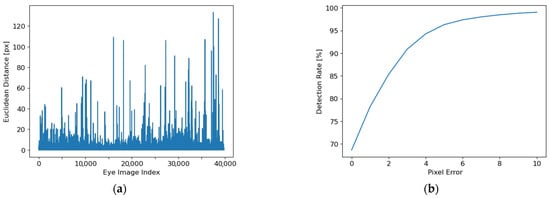 Results of the inference for all 20 databases: (a) Euclidian distances for each of the ~40 k images; (b) detection rates depending on pixel error for the eye images in all databases.