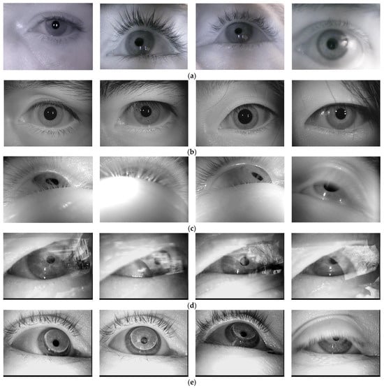 The performance of the proposed AI-based pupil detection system, in terms of detection accuracy, was tested on ~40,000 eye images taken from 20 different databases available in the literature [,,,]. In Figure 12, some representative eye images from these databases are illustrated.