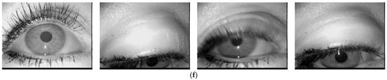 Samples of the eye images used in our study from different databases: (a) DB1; (b) DB2; (c) DB3—Świrski database; (d) DSI—with reflections; (e) DSIV—with contact lenses, bad illumination; (f) DSXVI—with mascara, eyelashes.