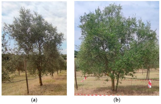 An olive orchard was selected for the experimentation. The orchard was 1.95 ha, designed as a germplasm trail orchard, with five different cultivars (Pendolino, Colombino, Scarlinese, San Francesco, Piangente). The olive trees were planted in June 2009 with a 5 × 6 m planting layout; the primary orientation was north–south, and the plants were managed with a multi-branched (polyconic) vase pruning management (Figure 1). A drip irrigation system could allow the irrigation of the orchard, but it was not used during the experimentation season.