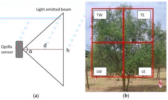 Schematic representation of the light beam measure (a) and schematic representation of the canopy subsetting based on the exposure and the height, namely TW: Top–West, TE: Top–East, LW: Low–West, and LE: Low–East (b).