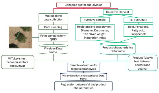 Flow chart of the applied methodology for data collection and data analysis. In red, the starting point of data collection; in dark green, the workflow for VI data; in light green, the workflow for product data; in dark blue, the process for regression study between VIs and product characteristics.