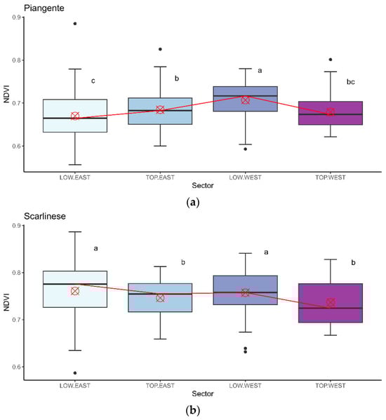 Boxplot for the different sectors and cultivars for the NDVI index. In (a), the PT cultivar’s data are presented; in (b), the data for the SC cultivar are presented. The red cross specifies the mean positioning, and the red line defines the difference in positioning between the various medians, highlighting the variation in median values between the sectors. The letters near the boxplots state the differences between the values; different letters indicate a statistically significant difference (p ≤ 0.05) in Tukey’s test.