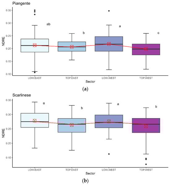 Boxplot for the different sectors and cultivars for the NDRE index. In (a), the PT cultivar’s data are presented; in (b), the data for the SC cultivar are presented. The red cross specifies the mean positioning, and the red line defines the difference in positioning between the various medians, highlighting the variation in median values between the sectors. The letters near the boxplots state the differences between the values; different letters indicate a statistically significant difference (p ≤ 0.05) in Tukey’s test.